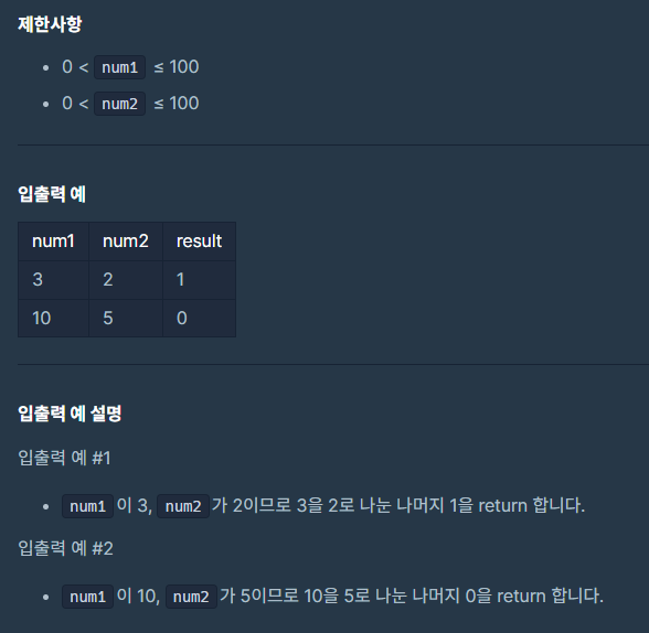 ์ ์ num1. num2 ๊ฐ ๋งค๊ฐ๋ณ์๋ก ์ฃผ์ด์ง ๋, num1๋ฅผ num2๋ก ๋๋ ๋๋จธ์ง๋ฅผ return ํ๋๋ก solution ํจ์๋ฅผ ์์ฑํด์ฃผ์ธ์.